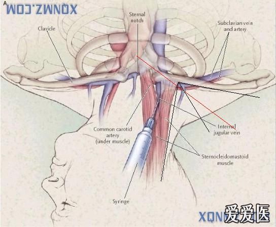 上面两张图黑线分别是胸锁乳突肌外侧缘和锁骨上缘,中间黑线线为两线夹角平分线,红线为穿刺方向。